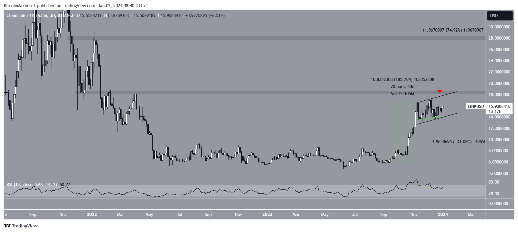 A pesar de alcanzar un máximo en 2023 de 17.67 dólares el 28 de diciembre, el precio del LINK creó una larga mecha superior (icono rojo) y cayó.