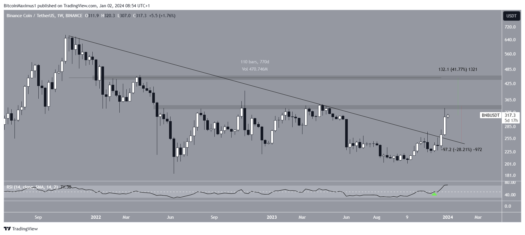El precio de BNB ha aumentado desde octubre de 2023, cuando se negociaba en un mínimo de 202 dólares. El movimiento alcista causó una ruptura de una línea de tendencia de resistencia descendente a largo plazo que había estado vigente durante más de 770 días. El aumento le llevó a un máximo de 320 dólares la semana pasada.