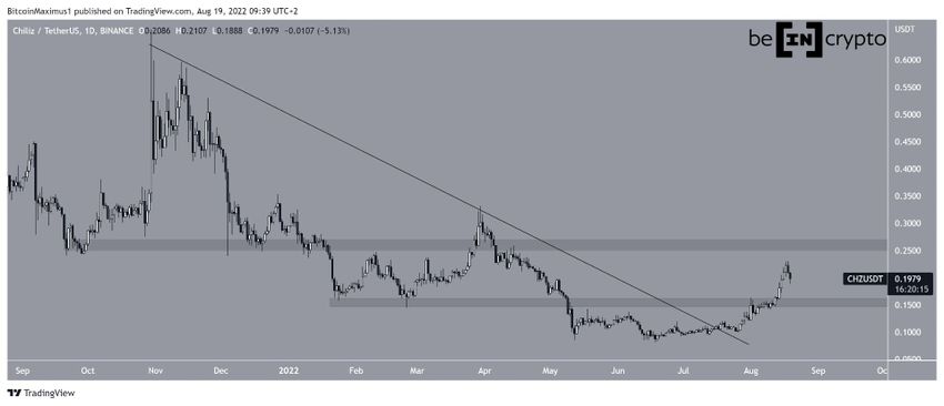 CHZ ha estado aumentando desde el 18 de junio. El movimiento a la baja provocó una ruptura de una línea de resistencia descendente y condujo a un máximo de 0.26 dólares el 18 de agosto.