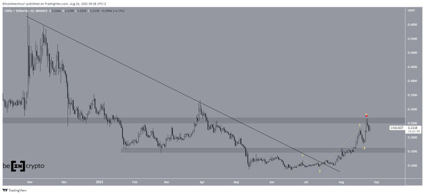 CHZ ha estado aumentando desde el 18 de junio. El movimiento ascendente provocó una ruptura de una línea de resistencia descendente y llevó a un máximo de 0.26 dólares el 23 de agosto.