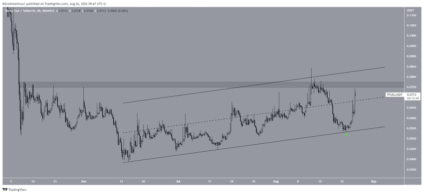 TFUEL ha estado aumentando dentro de un canal paralelo ascendente desde el 18 de junio. El 23 de agosto, rebotó en la línea de soporte del canal e inició un fuerte movimiento ascendente (icono verde). Esto provocó una recuperación de la mitad del canal el 25 de agosto.