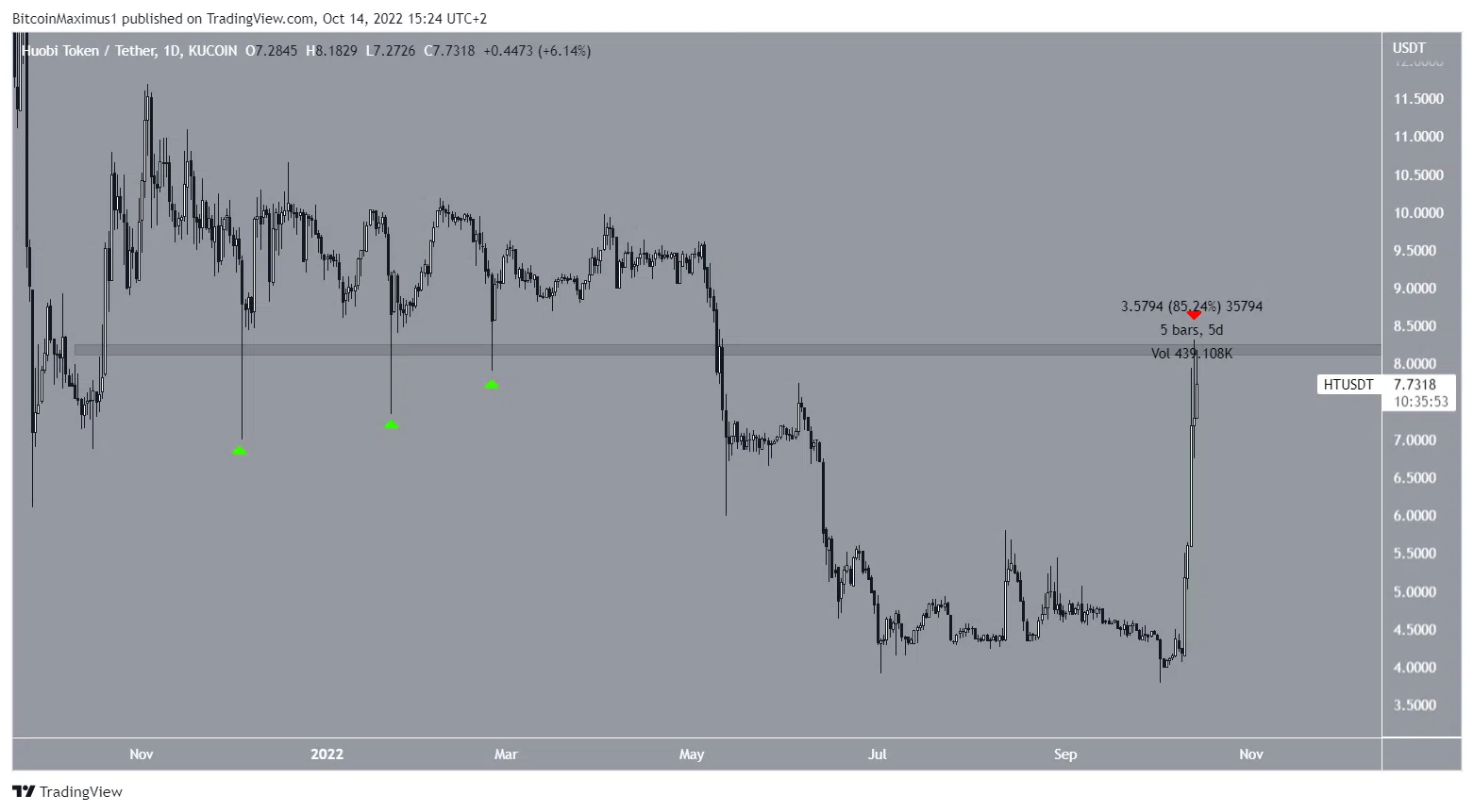 El precio de Huobi Token comenzó un movimiento ascendente masivo el 19 de octubre y aumentó un 85% en un lapso de solo cinco días. Esto llevó a un máximo de 8.20 dólares. Sin embargo, el precio de Huobi Token fue rechazado por el área de resistencia horizontal de 8.10 dólares y creó una mecha superior larga.