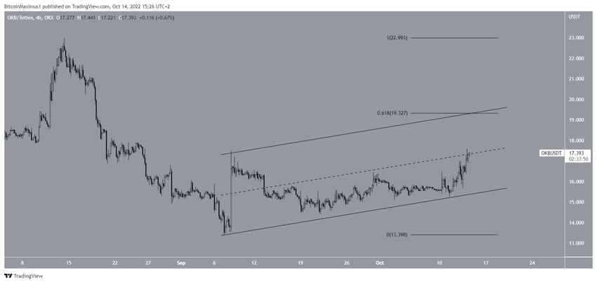 OKB inició un movimiento ascendente después de rebotar en la línea de soporte del canal el 10 de octubre. Actualmente está intentando moverse por encima de su línea media. La línea de resistencia del canal está en 19.32 dólares.