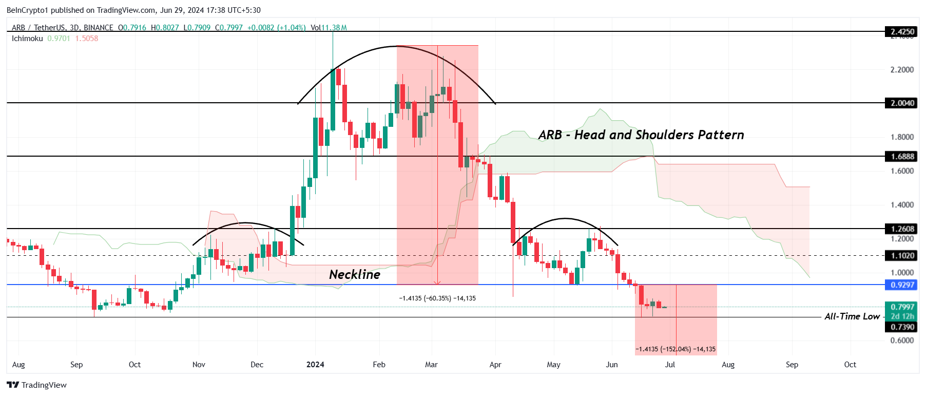Una vez que se rompe la línea de cuello, indica una posible reversión de la tendencia de alcista a bajista. Basado en este patrón, el precio objetivo de Arbitrum se proyecta en 0 dólares. Sin embargo, esto es absurdo porque ARB es un activo fundamentalmente sólido.
