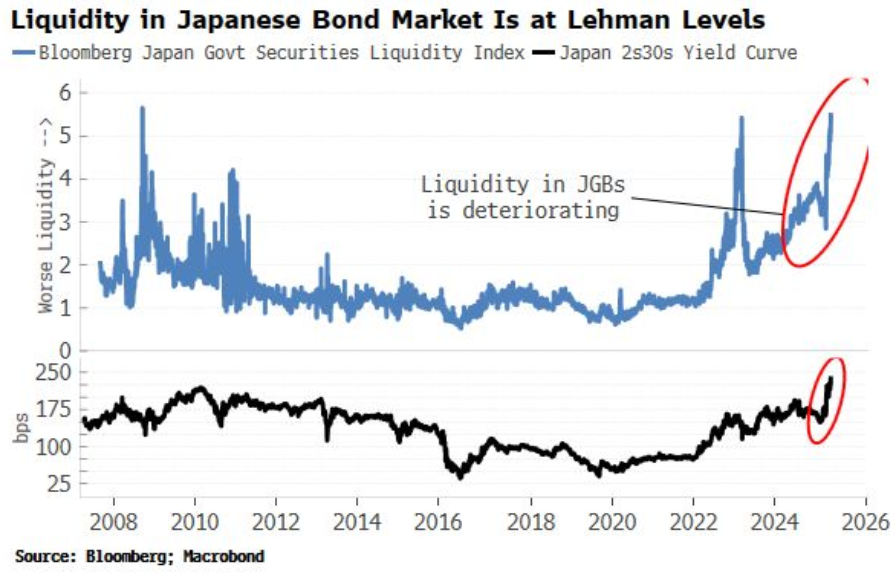 “La liquidez del mercado de bonos de Japón ha caído a niveles de la crisis de Lehman de 2008. ¿Estamos a punto de experimentar otra crisis financiera?” escribió Financelot en X (Twitter).