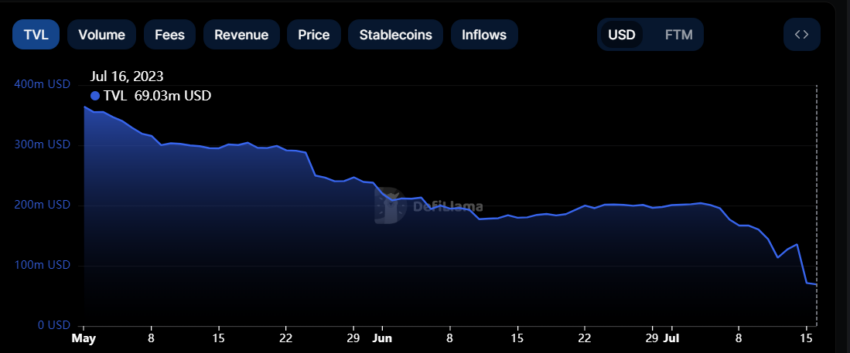 Los datos on-chain de DeFiLlama muestran que el TVL de Fantom ha disminuido en más del 80%, cayendo a 69,03 millones de dólares desde su máximo de mayo de 364 millones de dólares.