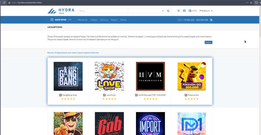 Hydra market es el mercado negro más grande de Rusia que está ubicado en la Darknet. Fue creado en el 2015 con un fuerte enfoque en proporcionar una plataforma clandestina para que los usuarios anónimos compren drogas, pero también incluye servicios de piratería, documentos falsificados, datos robados y otros bienes ilícitos.