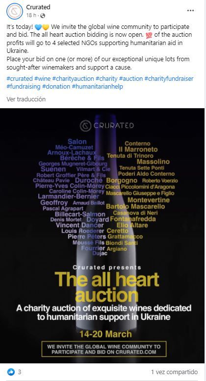 Sponsored“Invitamos a la comunidad mundial del vino a participar y pujar. La subasta de todo corazón está abierta. El 100% de las ganancias de la subasta irán a 4 ONG seleccionadas que apoyan la ayuda humanitaria en Ucrania. Haz tu oferta por uno (o más) de nuestros excepcionales lotes únicos de los enólogos codiciados y apoya una causa”.