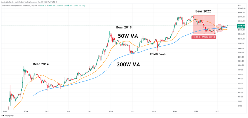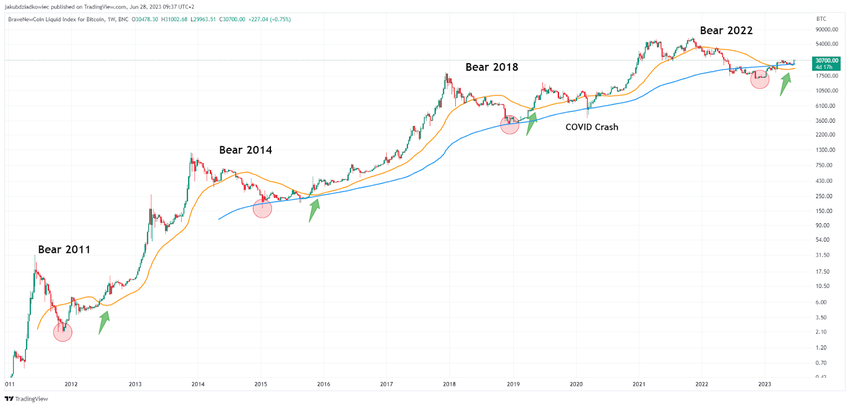 Si esta regla también se cumple para el ciclo actual, la caída de FTX de noviembre de 2022 y el precio de BTC en 15,600 dólares marcarían el final de las caídas a largo plazo. Por lo tanto, el rebote MA de 50W es otro argumento para iniciar un nuevo mercado alcista para todo el sector de las criptomonedas.