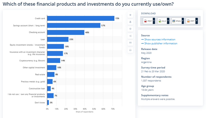 Los datos de Statista también muestran que las criptomonedas son actualmente el séptimo instrumento financiero más utilizado en Argentina, por delante de los elementos tradicionales como bienes raíces y metales preciosos.