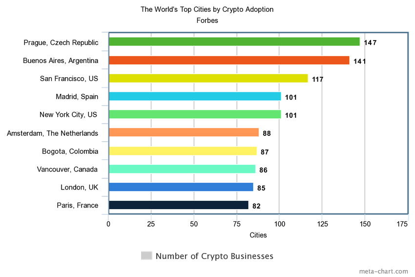 Una clasificación realizada por Forbes durante el 2019 en la cual se valoraron las 10 ciudades más amigables con las criptomonedas alrededor del mundo incluyó solo dos ciudades de mercados emergentes. Ambas son latinoamericanas: Buenos Aires en Argentina y Bogotá en Colombia.