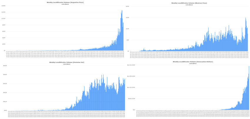 Lo más revelador es que el número de transacciones de Bitcoin con valor fiduciario en Argentina, Perú, México y Venezuela se ha incrementado enormemente durante el año pasado y no muestra signos de disminuir, como se muestra a continuación: