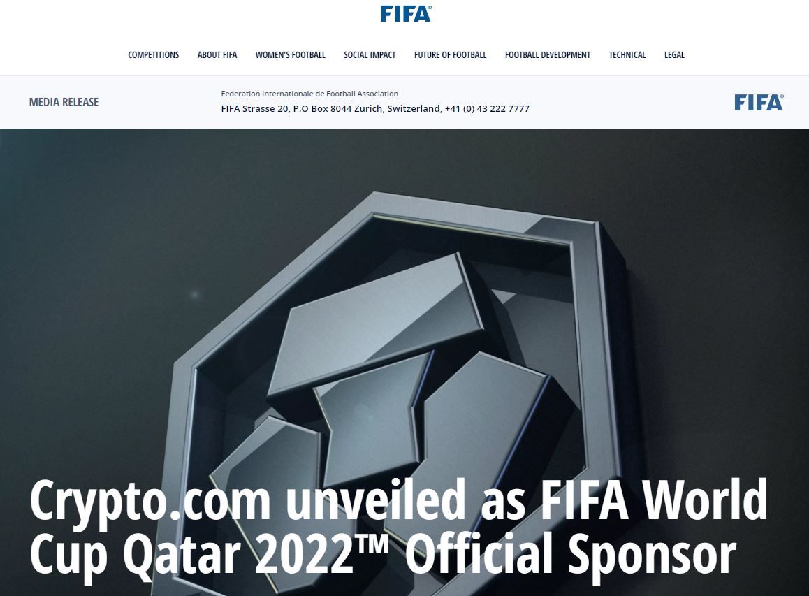 La Federación Internacional de Fútbol (FIFA) anunció al exchange Crypto.com como su patrocinador oficial (exclusivo) para la Copa Mundial Qatar 2022, a realizarse del 21 de noviembre al 18 de diciembre próximo, por lo que la empresa gozará de una exposición de marca al interior de los estadios y en los principales partidos.