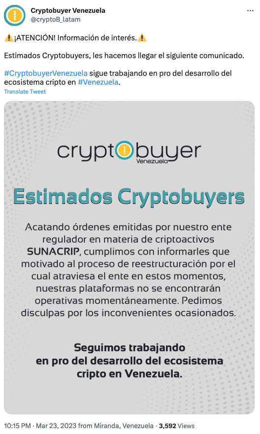 La misma fuente que informó a BeInCrypto también citó como “todos los exchanges fueron cerrados desde el lunes por la tarde en Venezuela”. Por ende, las operaciones de los exchanges de criptomonedas venezolanos estaban siendo también afectados por el caso de la SUNACRIP. Recientemente, se ha podido obtener confirmar esta alegación ya que el afamado exchange de criptomonedas venezolano, Cryptobuyer, ha informado sobre cese de sus operaciones de manera temporal tras órdenes directas de la SUNACRIP.