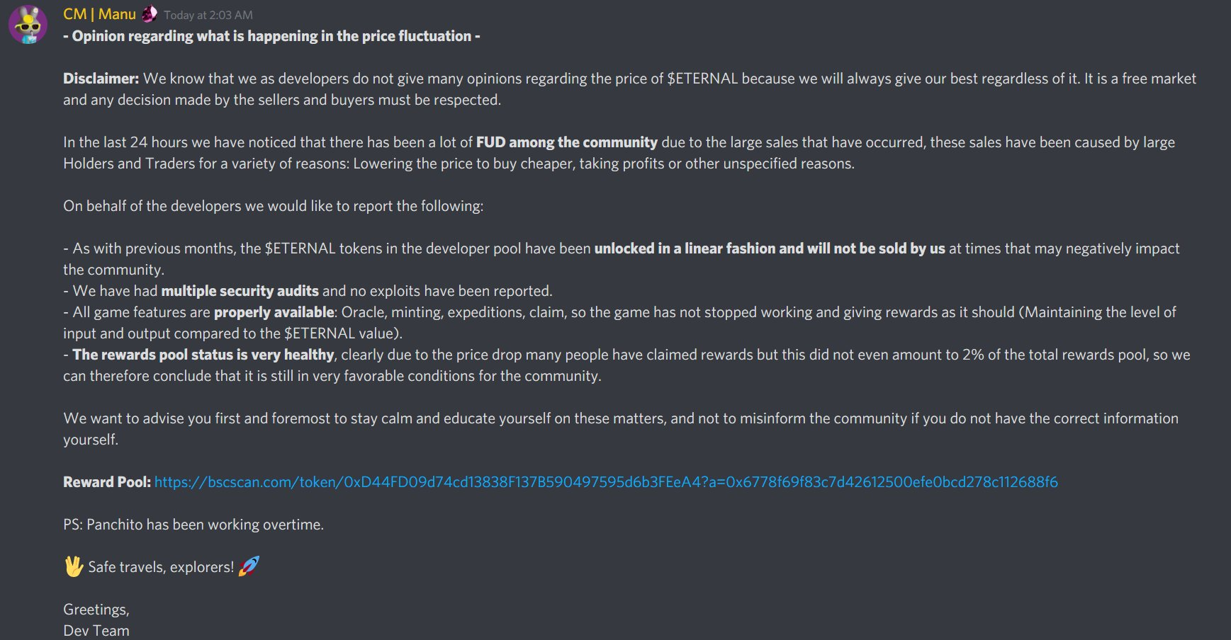 “Es un libre mercado y cualquier decisión de parte de los vendedores y compradores se debe respetar. En las ultimas 24 horas hemos notado que ha existido mucho FUD entre la comunidad debido a las ventas grandes que han ocurrido. […] Al igual que los meses anteriores, los token $ETERNAL del fondo de desarrolladores se han desbloqueado de manera lineal y no serán vendidos por nuestra parte en momentos que pueda impactar negativamente a la comunidad”.