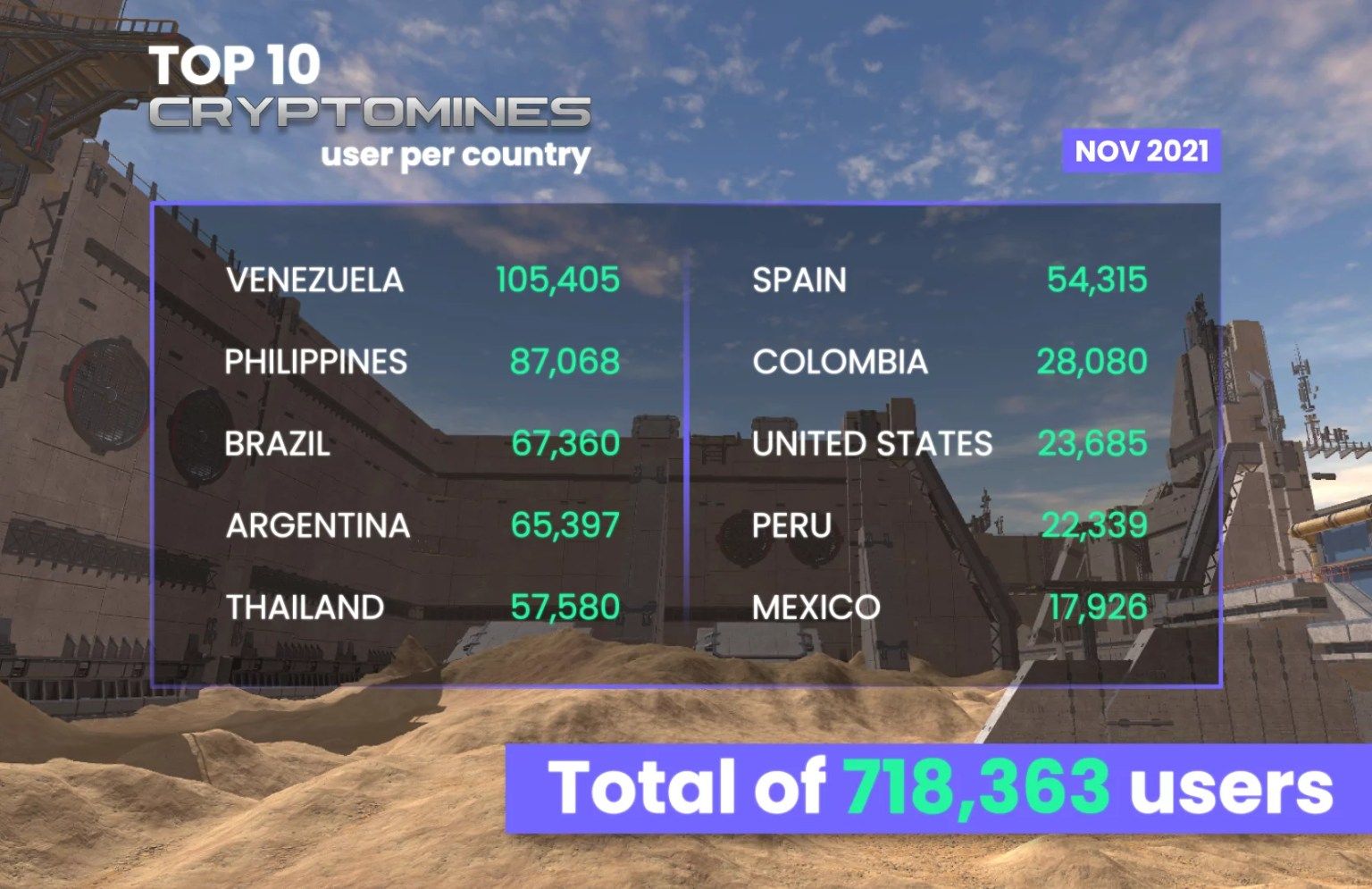 De acuerdo a las propias estadísticas del proyecto publicadas en noviembre, Venezuela domina el ranking mundial de jugadores de CryptoMines, superando por amplio margen a Filipinas, otro nicho importante para los videojuegos Play to Earn.