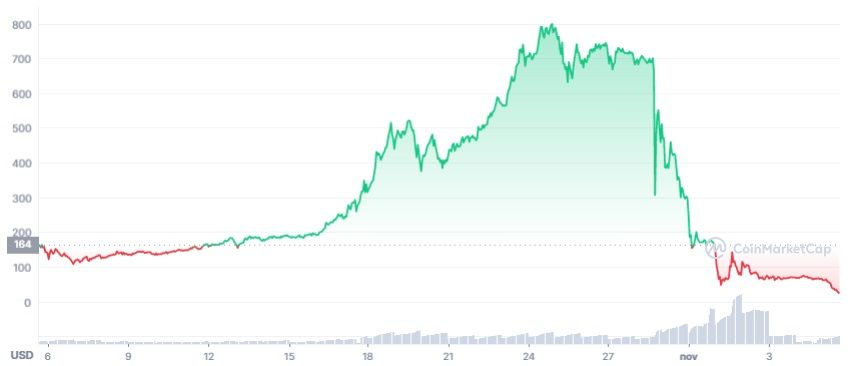 SponsoredSin embargo, desde finales de noviembre el token ha registrado un desplome descomunal del 96% y, al momento de la publicación cotiza en 27 dólares, según los datos de CoinMarketCap.