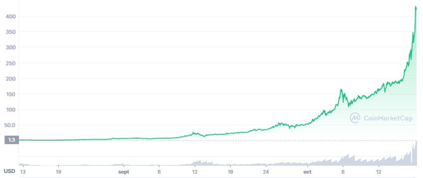 Desde entonces, el token ha experimentado un crecimiento meteórico, alcanzando el día de hoy un nuevo máximo histórico de 444.33 dólares. Esta cifra representa un crecimiento abismal del más del 78,000% desde su punto más bajo.