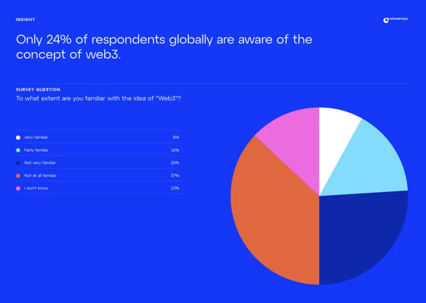 Según una nueva encuesta realizada, sólo el 24% de las personas afirman estar familiarizadas con la Web 3.0. Comparativamente, las tecnologías relacionadas, como el metaverso y las NFT, tuvieron una tasa de reconocimiento ligeramente mayor, con 36% y 34%, respectivamente.