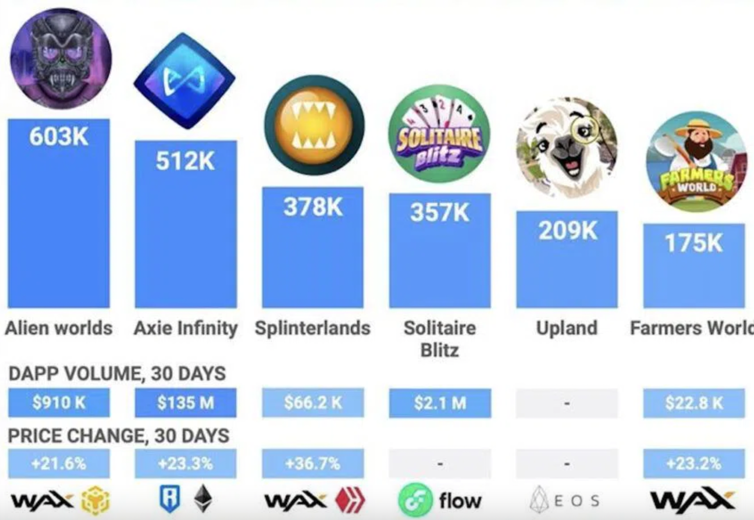 Según datos de DappRadar, Alien Worlds recibe aproximadamente 230,000 visitantes diarios. El juego es un obstáculo importante para sus competidores. Albergó más de 600,000 direcciones únicas en total en el último mes.