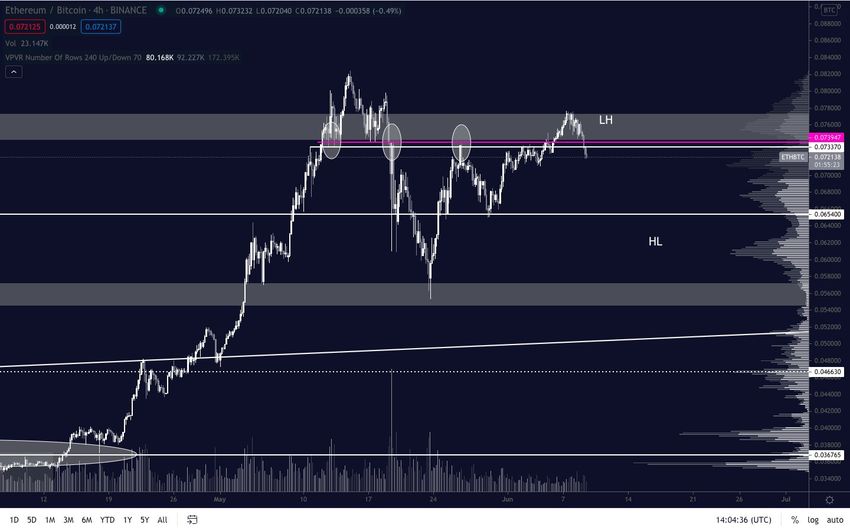 Ha estado bajando desde el 15 de mayo y creó un máximo inferior el 8 de junio. El máximo se hizo justo en la resistencia de retroceso de 0.786 Fib en ₿0.076