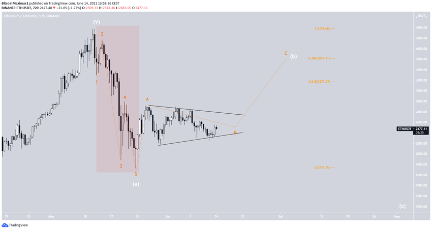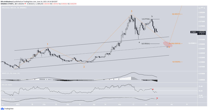 El recuento de ondas indica que ETH está en una onda cuatro de largo plazo (roja), de un impulso alcista que comenzó en diciembre de 2020.