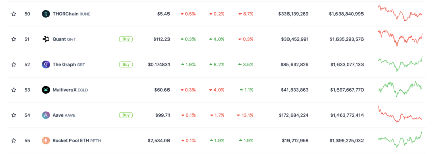 AAVE: token nativo del protocolo de finanzas descentralizadas del mismo nombre (DeFi). A pesar del impresionante aumento del mercado de criptomonedas en las últimas semanas, todavía cotiza -85% por debajo del máximo histórico alcanzado en mayo de 2021.