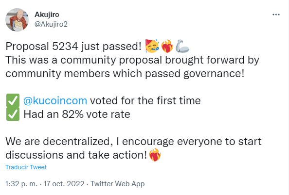 Con la aprobación de la iniciativa por parte de la gobernanza de LUNC, el usuario de Twitter, Akujiro, destacó que los miembros de la comunidad la habían presentado. Akujiro dijo que la propuesta tenía una tasa de votación del 82% e incluía la participación por primera vez del exchange de criptomonedas KuCoin.
