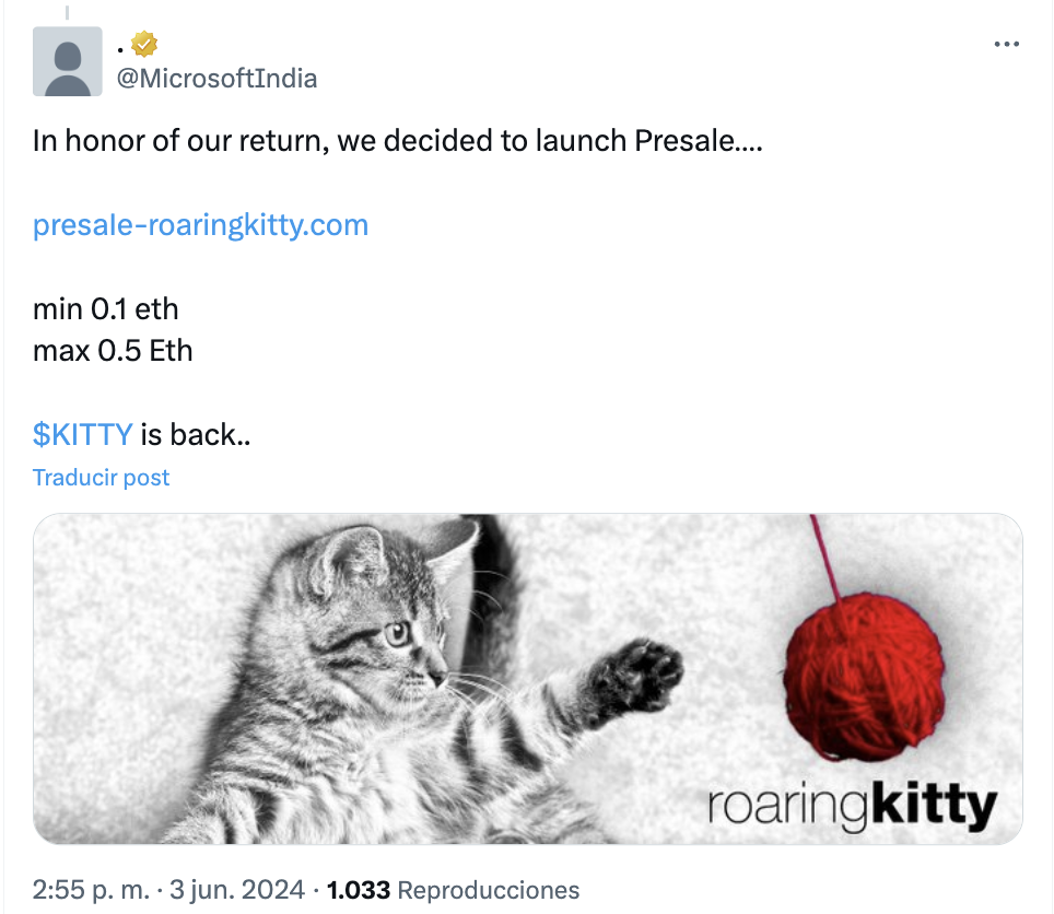 Denuncias señalan que uno de los responsables del hack a la cuenta de Microsoft India podría ser el popular trader Keith Gill, también conocido como “Roaring Kitty”. La cuenta de X compartió un airdrop falso bajo la leyenda: “In honor of our return, we decided to launch Presale #KITTY is back”