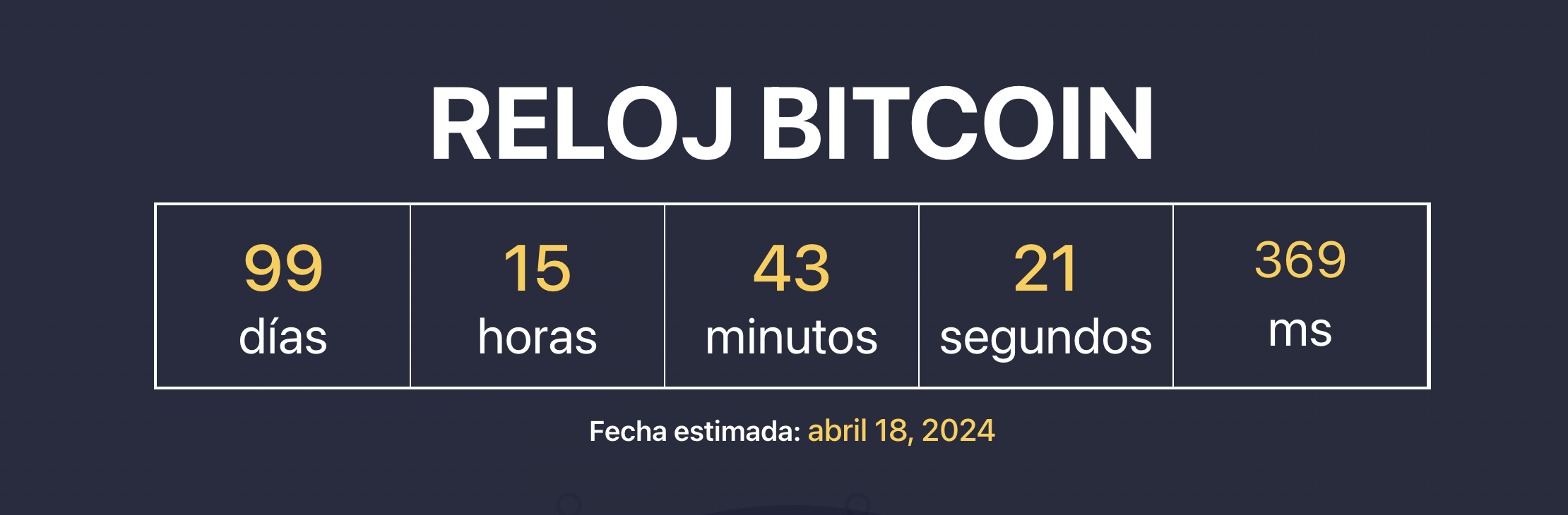 El reloj Bitcoin mostró que faltan menos de 100 días, así como 14,978 bloques hasta el halving. La previsión alcista del precio de BTC y de las criptomonedas en 2024 es una de las más positivas de la historia, ya que suma hechos relevantes como la aprobación de un fondo cotizado en bolsa (ETF) y de las elecciones presidenciales de Estados Unidos.