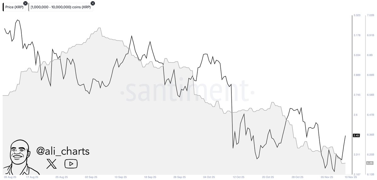 Según datos on-chain compartidos por el analista Ali Martinez, los monederos con entre 1 y 10 millones de XRP han vendido cerca de 90 millones de tokens en las últimas 72 horas. Este patrón de distribución refleja cautela entre los grandes holders ante la posible volatilidad del lanzamiento.
