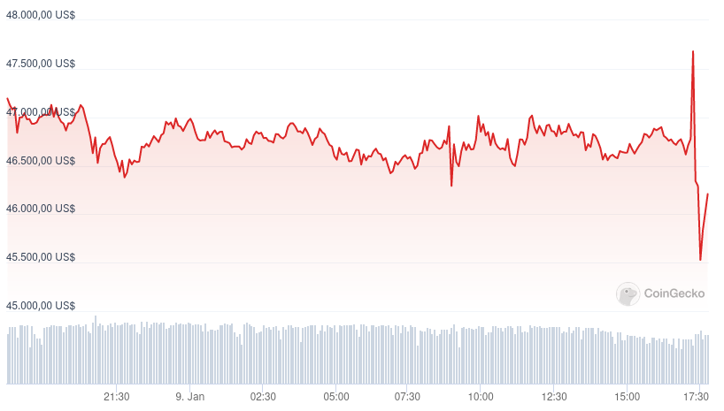Tras el boom momentáneo, el precio de Bitcoin experimentó un movimiento volátil hasta alcanzar un nuevo máximo local en 47,680 dólares, para caer minutos después hasta los 45,528 dólares.