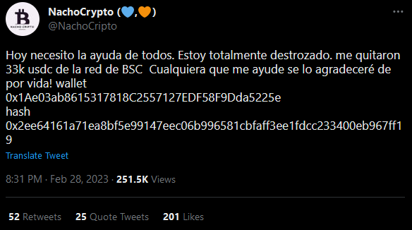 El pasado 28 de febrero, el usuario latino NachoCrypto publicó por su cuenta de Twitter solicitando ayuda a sus seguidores para comprender cómo le robaron más de 33,000 USDC que tenía en su monedero Metamask, conectado a la red de BNB Chain.