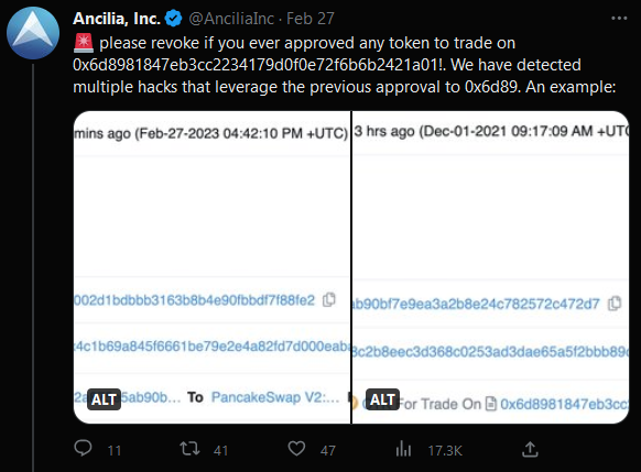 Luego, a horas de la tarde de ese 27 de febrero, Ancilia, Inc, una agencia de seguridad de la BNB Chain, alertaba por su cuenta de Twitter que justamente la dirección, que iniciaba con 0x6d89, por la cual drenaron a NachoCrypto sus 33 mil USDC, estaba drenando los fondos de todas las direcciones que aprobaron un intercambio con esta en el pasado, ya que antes del hackeo funcionaba como un exchange descentralizado, DEX por sus siglas en inglés.