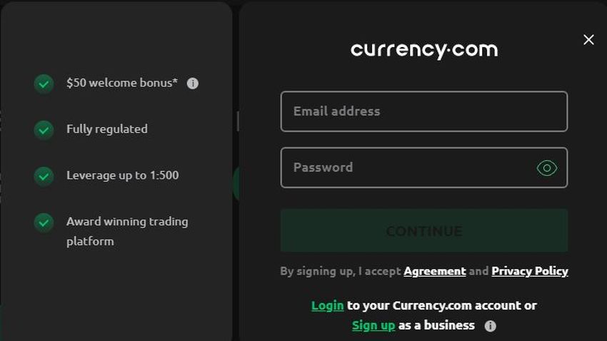 El proceso de registro es bastante sencillo. Simplemente vaya a la página web de Currency.com y presione el botón de registro. Solo necesitará ingresar su nombre, dirección de correo electrónico, domicilio y número de teléfono.