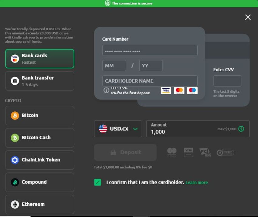 El monto mínimo de depósito es de 10 dólares si está depositando dinero fiduciario con una tarjeta de crédito/débito y 50 dólares si está utilizando una transferencia bancaria. Y si está depositando en criptomonedas, la cantidad mínima de depósito es 0.001 BTC o 0.003 ETH (o una cantidad equivalente aproximada si deposita cualquiera de las otras criptomonedas admitidas).