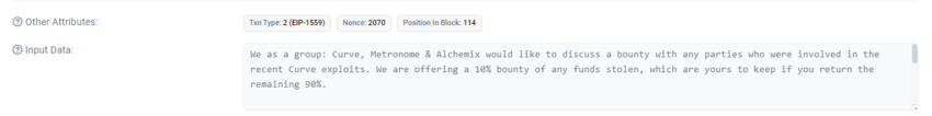 El consorcio Curve Finance, Metronome y Alchemix presentó una propuesta en un mensaje cifrado en Etherscan. El mensaje decía que estaban ofreciendo un incentivo del 10% a los hackers tras la devolución segura de los fondos restantes.