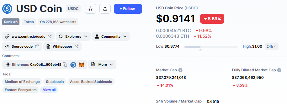 En consecuencia, los traders iniciaron la conversión de sus USDC en otras criptomonedas, provocando que la capitalización de mercado de la stablecoin cayera 14% y perdiera su paridad con el dólar. Al momento de la publicación, USDC cotiza en 0.9141 dólares, según CoinMarketCap.