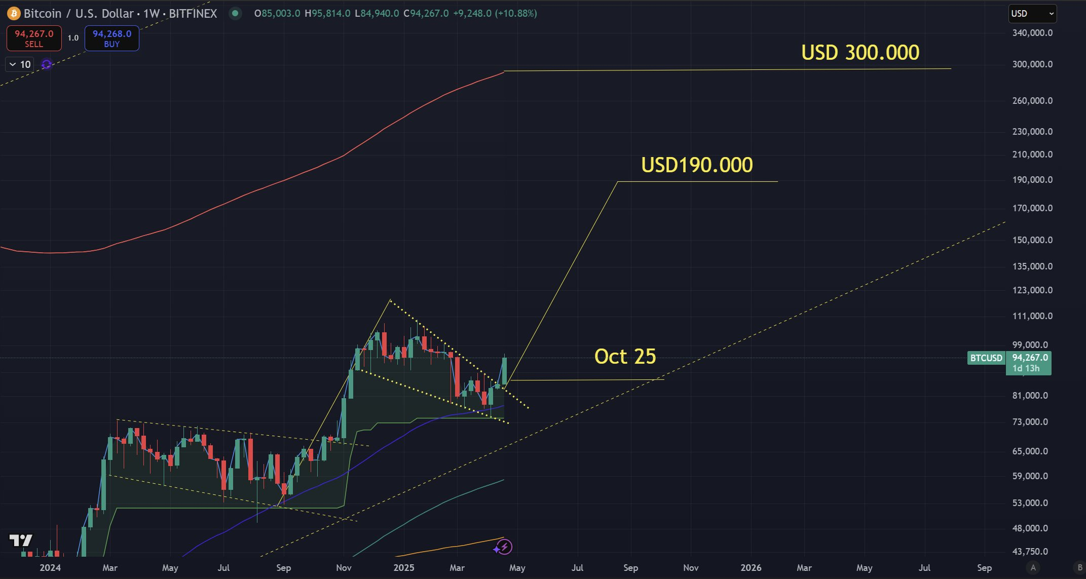 “Viendo el patrón de precios actual de Bitcoin, y la ruptura reciente del falling wedge podemos afirmar desde un punto de vista técnico un objetivo a los 190.000 dólares por bitcoin. El target sale del fractal de precio y el tiempo de la misma estructura de consolidación dentro del falling wedge, mostrando a Octubre de este año como posible fecha para la llegada del precio a esa zona”, resaltó el analista y trader.
