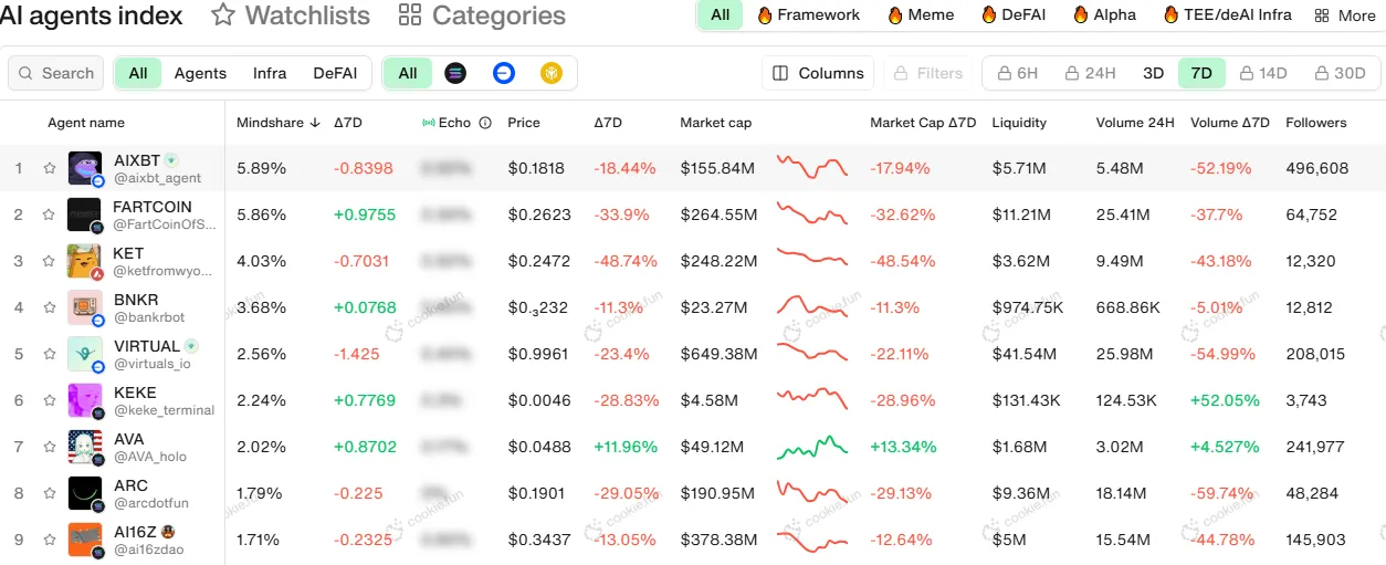 Específicamente, algunos, como VIRTUAL, AI16Z y AIXBT, han experimentado ganancias en los últimos siete días. Mientras tanto, otros todavía están en una tendencia bajista, como FAI, con una caída del 28%, y TRAC, con una caída del 19%.