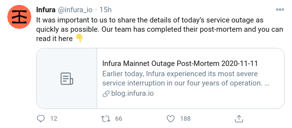 “Con suerte, esto ayudará a fortalecer DeFi: más aplicaciones deberían ejecutar sus propios nodos y/o usar copias de seguridad de Infura”.