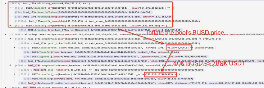 SponsoredSegún la firma, el hacker manipuló el precio del swap del pool actuando como proveedor de liquidez y como swapper, lo que les permitió vaciar el pool con una suma de 282,889 BUSD y 290,868 USDT.