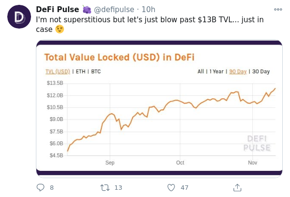 El sector DeFi ha reanudado su impulso alcista en términos de valor total bloqueado (TVL), que ha alcanzado un nuevo récord de 13 mil millones de dólares, según DeFi Pulse.