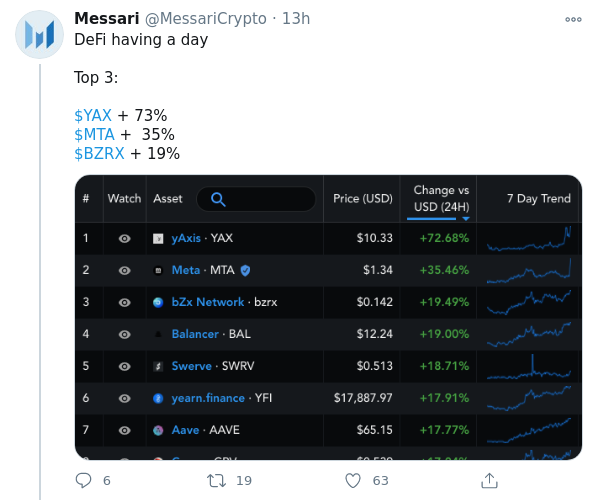 El token YAX de yAxis es el de mejor rendimiento y ayer contó con un aumento de más del 90%, mientras que el token MTA de Meta aumentó un 50%.