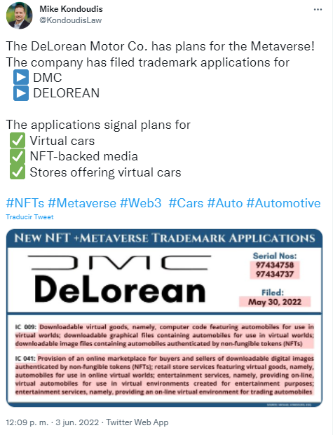 Kondoudis resaltó que la solicitud aplica para DMC y DeLorean y abarca planes para coches virtuales, medios respaldados por NFT y tiendas que ofrecen coches virtuales.