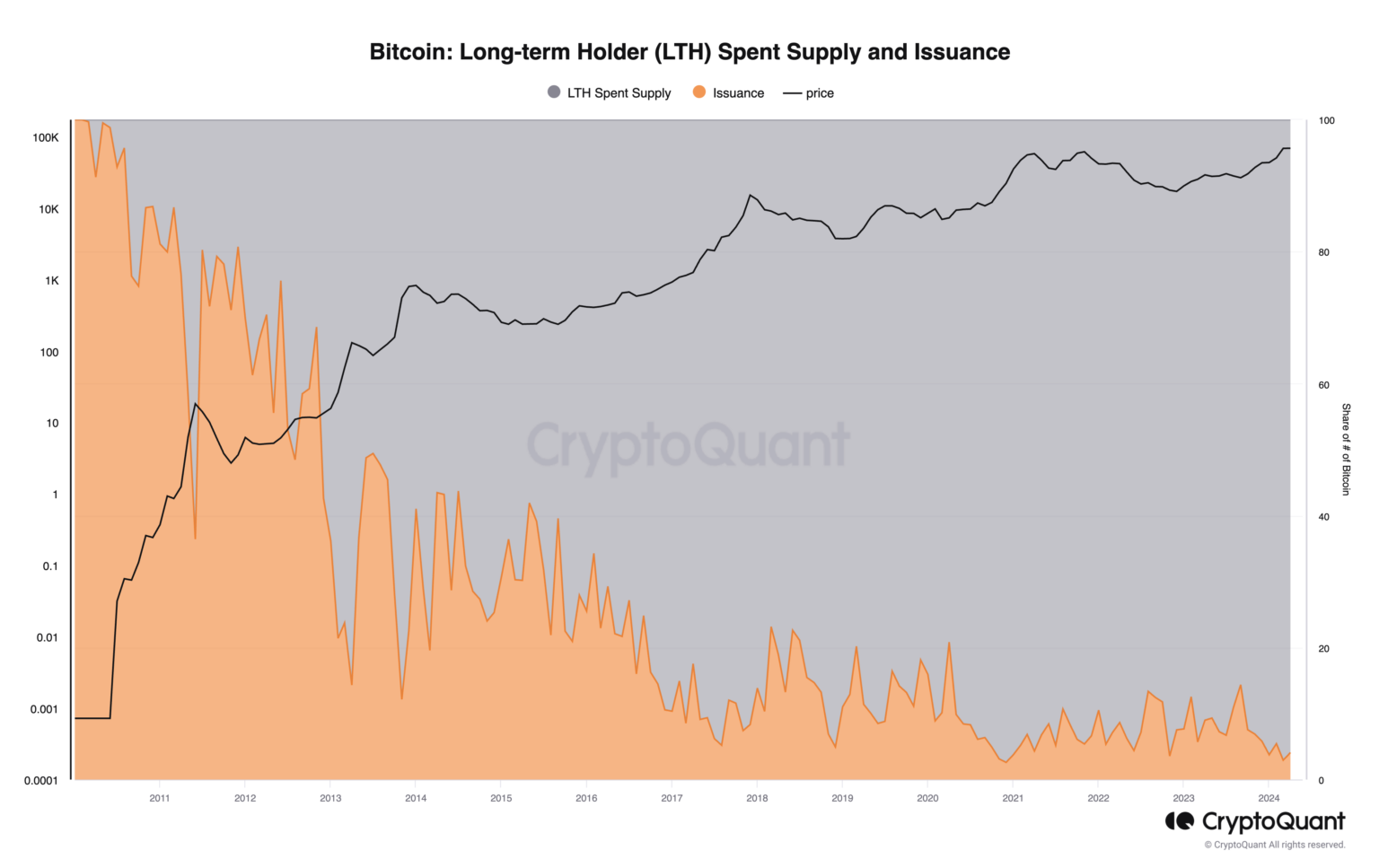 Esto es significativamente más que la emisión mensual de aproximadamente 28,000 BTC, que se reducirá a unos 14,000 tras el halving. CryptoQuant también señala que la emisión mensual de Bitcoin se ha reducido a sólo el 4% de la oferta total disponible de Bitcoin.