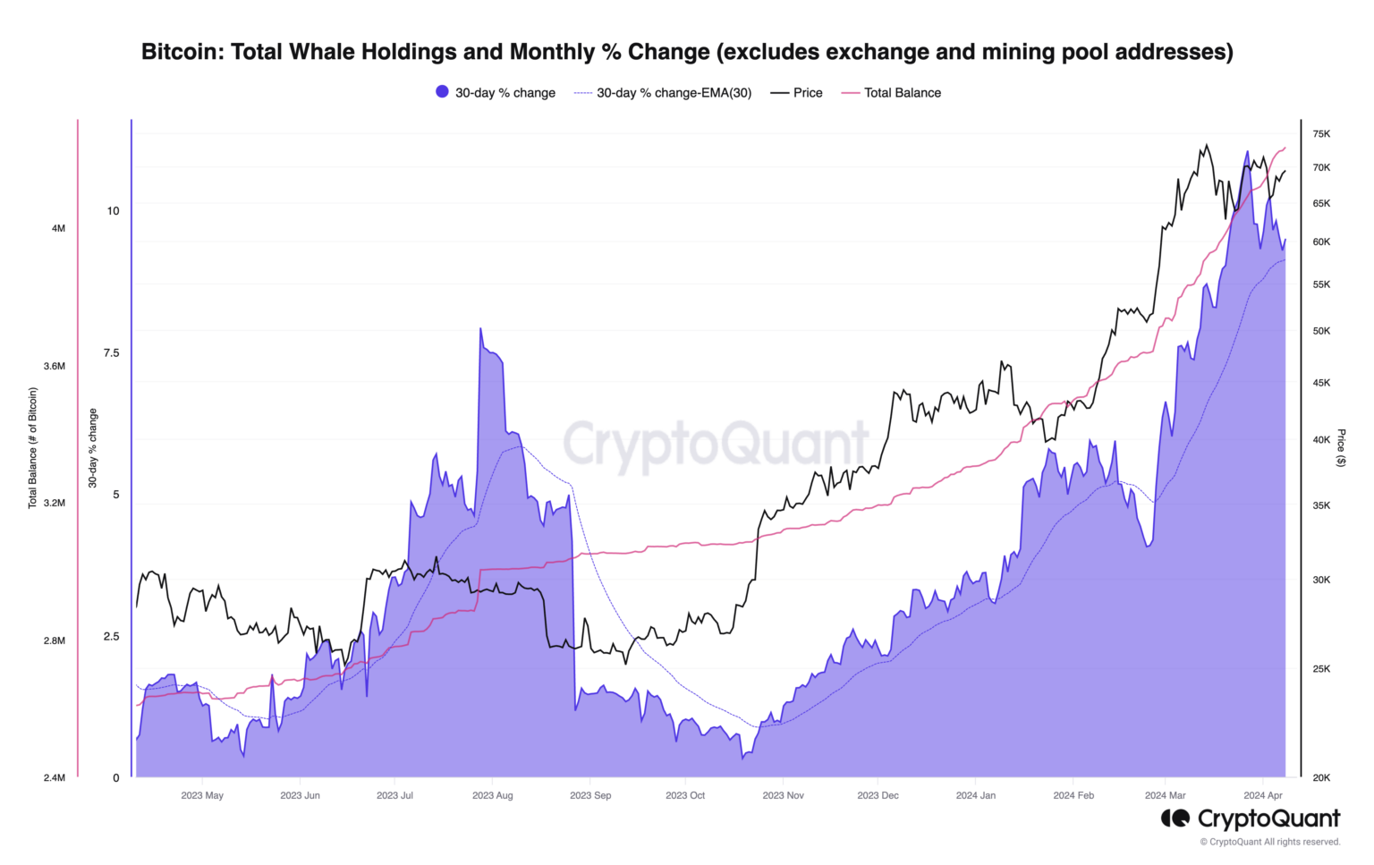 La venta de Long-term holders (LTH), por ejemplo, ha alcanzado una media de 417,000 BTC al mes en el último año, eclipsando la emisión mensual de 28,000. Por el contrario, CryptoQuant destaca que el crecimiento de la demanda de Bitcoin, en particular de los grandes holders o ballenas, se perfila como el principal motor de la subida de precios tras el halving.