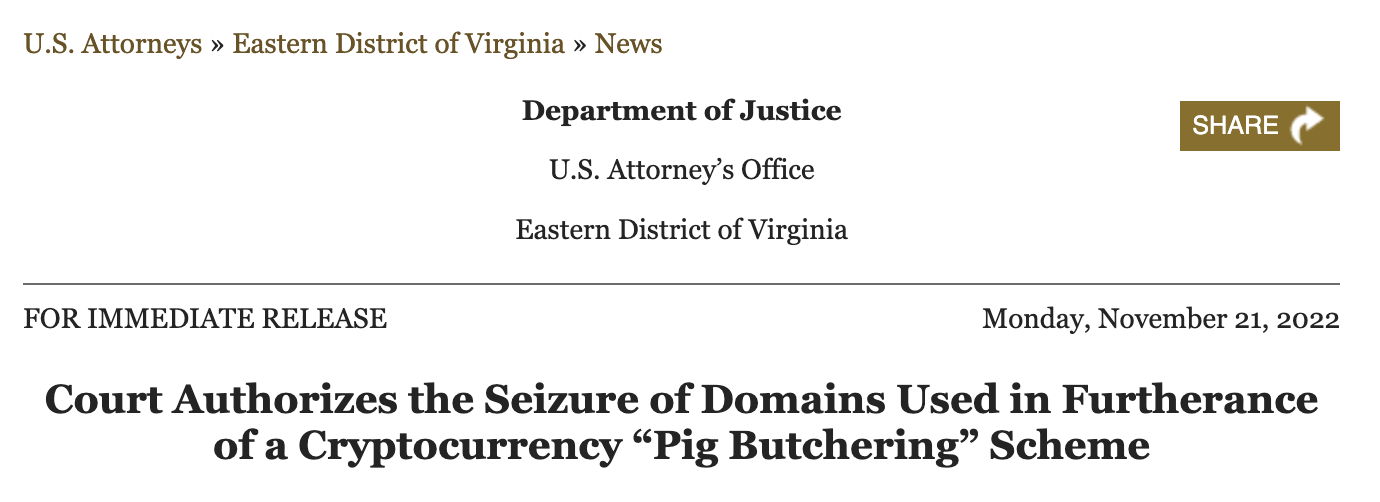 El Departamento de Justicia de Estados Unidos incautó siete sitios web utilizados por estafadores para perpetrar un scam de criptomonedas conocida como “matanza de cerdos” o pig butchering.