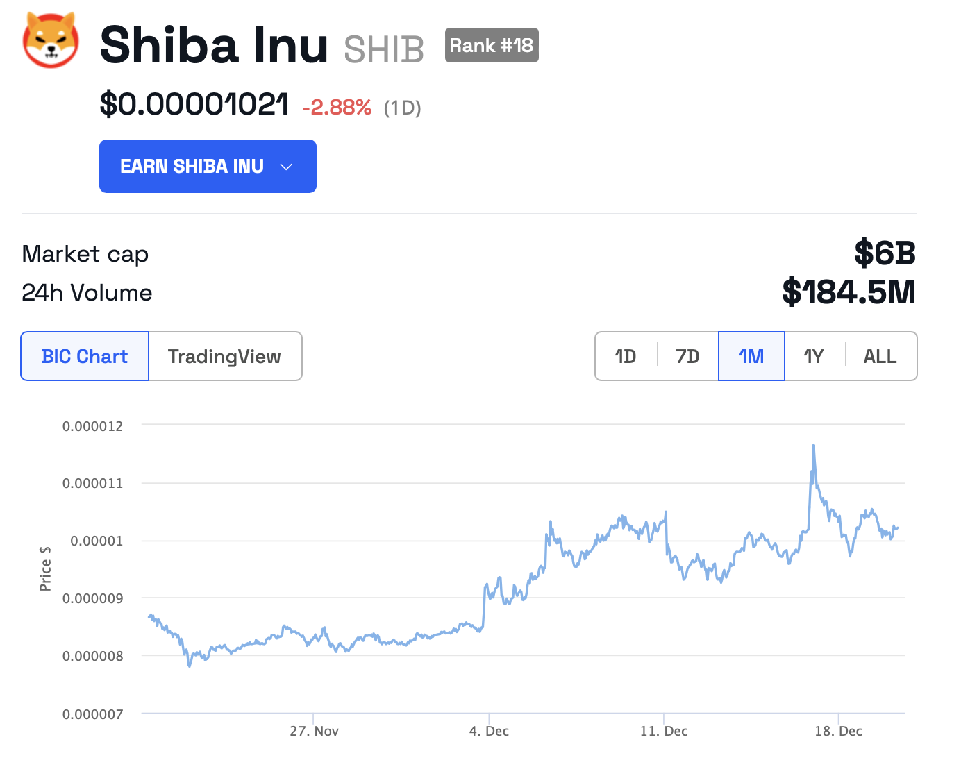 La criptomoneda meme BONK se ha convertido recientemente en la tercera memecoin con temática canina, tras Dogecoin y Shiba Inu. El precio de SHIB ha subido un 21.1% desde hace un año hasta 0.00001020 dólares.