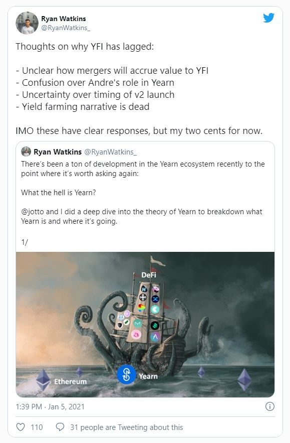 El investigador de Messari Ryan Watkins compartió sus pensamientos sobre por qué YFI se ha rezagado recientemente: